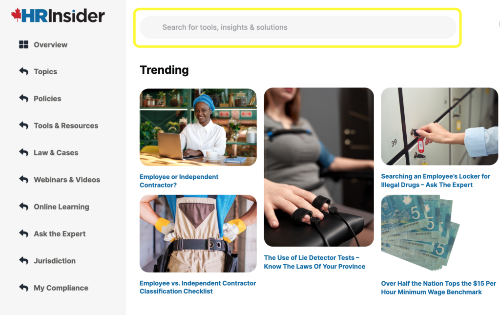 Searching on HR Insider is quite simple. Type in your keywords in the search bar located at the top of the screen.