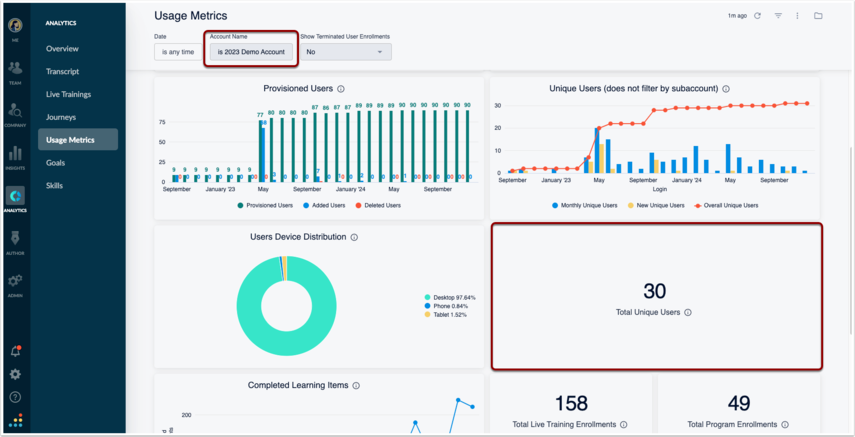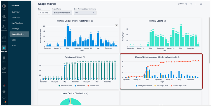 This will allow you to see growth of your user population over time, so you will need to adjust the filters to pull the report from contract start date to end date in the appropriate timeframes. This is found in Analytics > Usage Metrics > Unique Users (does not filter by subaccount).