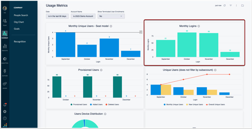 You can check all logins on a monthly basis through the Monthly Logins widget. You have the option to click on the meatball icon in the top right-hand corner to download the numbers for the entire time period chosen from the filtering option, or you can click directly on to a month and download the granular file for all users’ logins. Note that this widget is not for unique logins. If a single user logged in multiple times over the course of a single month, the report would hold every single one of their logins. If you remain consistent in your comparisons, you can send trends in behaviors month-over-month and year-over-year.