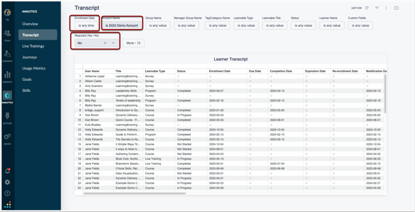 If you are encouraging your users to self-enroll in content for their own personal and professional development, you may also want to track those enrollments month-over-month and year-over-year. You can do this by pulling a report from either all time or within certain time pockets (potentially lining it up with your contract dates) and then filtering for “Required (Yes/No)” with the “no” value.