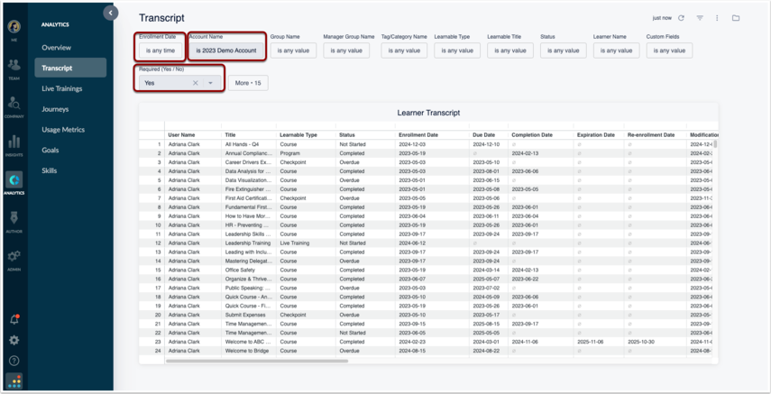 Another option is to pull a report by a specific manager if you want to ensure that accountability is happening amongst a particular department. You could also uncheck any criteria for the “Required (Yes/No)” filter, which will give you all enrollments for all learners under a manager assignment.