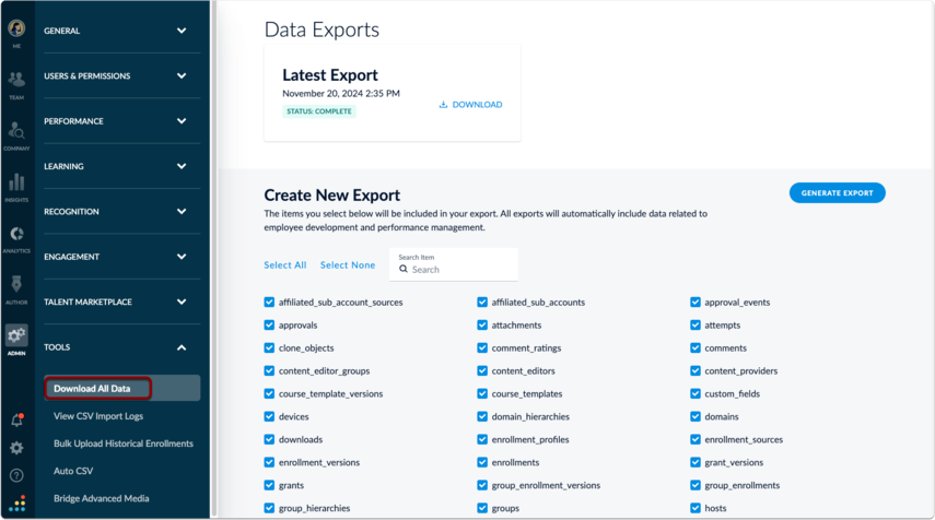 Domains.csv is a list of all domain relationships in Bridge, which includes users to a sub-account and users to a manager.