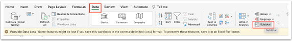 From here, highlight the table, select Data in your top ribbon, and then select Subtotal.