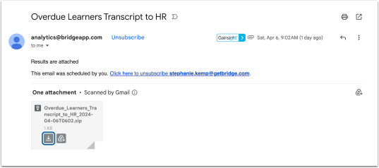 If you have scheduled to receive this report in cadence, it will arrive from analytics@bridgeapp.com. The title is customizable at time of report creation. Download the report, and it will open in a CSV file.