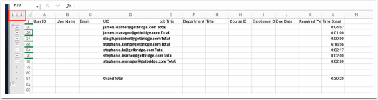 In the top left corner, you’ll see 1-2-3 which will show you Grand Total (1) with no detail, Total by Learner (2) with only hours, and the full detailed report (3) that you started with.