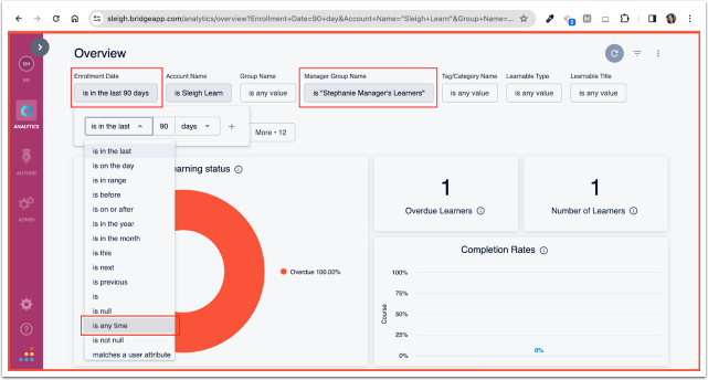 Change the Enrollment Date to “is any time” and the Manager Group Name to your Learners.