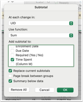 In Subtotal, at each change in “UID” (you could also use “User Name” but this could potentially show two independent users lumped into one group) use function “Sum” and Add subtotal to “Time Spent” as a summary below the data.