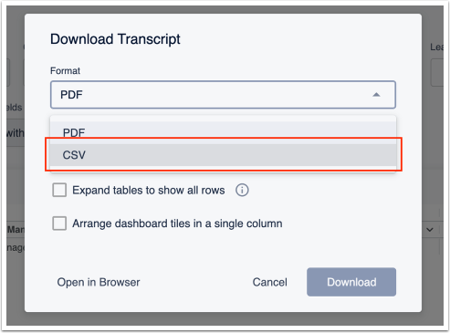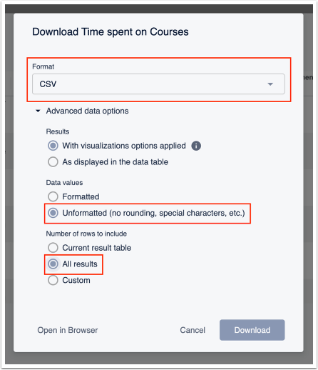 Change your format to CSV, and be sure to select “Unformatted” and “All results” in the Advanced Options Section to ensure your report is full before hitting the Download button.