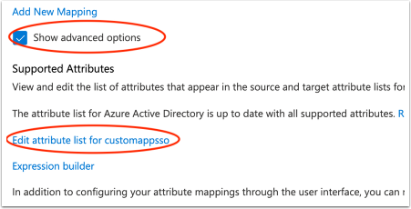 19. If the desired target attributes do not exist, click the Show advanced options checkbox at the bottom of the page and then click the Edit attribute list for customappsso link