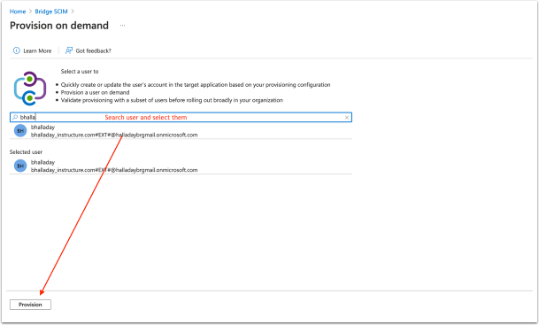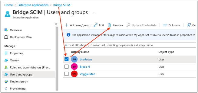 NOTE: if you DEACTIVATE the user in Azure before unassigning them, they will NOT be deleted in Bridge. They must first be unassigned in Azure from the Bridge SCIM app.