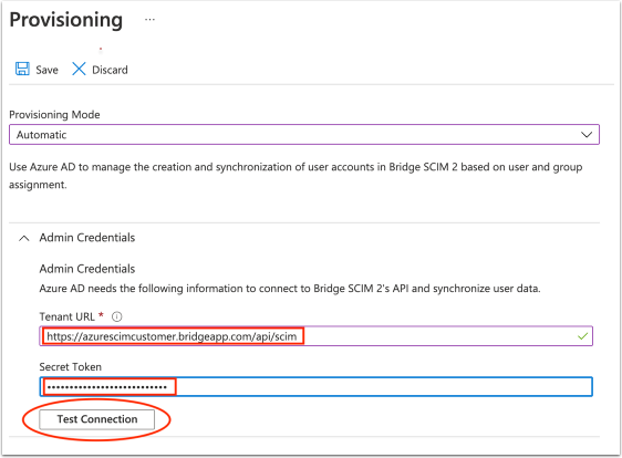 10. Fill in the Tenant URL, which should be the same as their Bridge URL with /api/scim on the end. Example: https://azurescimcustomer.bridgeapp.com/api/scim