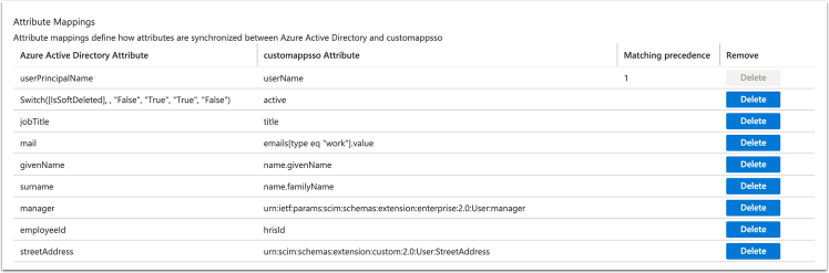 Azure Active Directory Attribute (Source) | customappsso Attribute (Target) | Bridge Attribute |