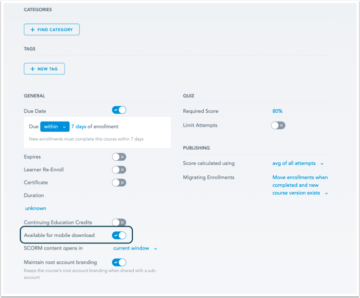 To enable the course for Offline learning, Toggle the Available for mobile download setting on.