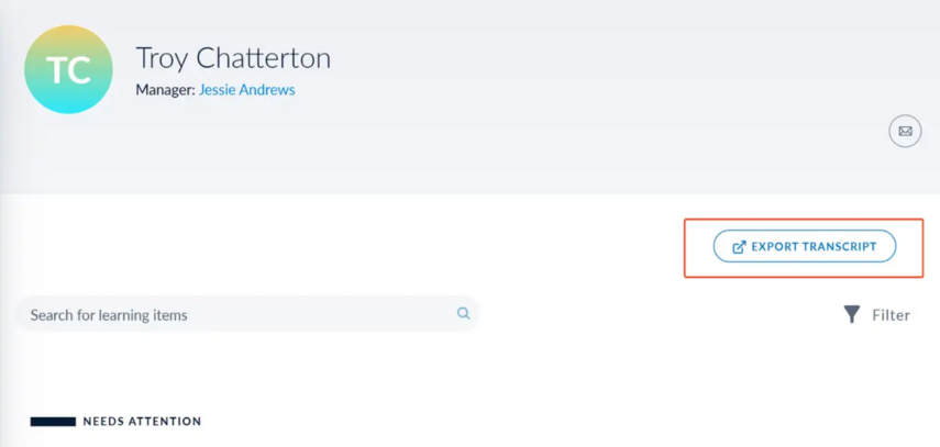 - Exporting an individual learner transcript from User Management.