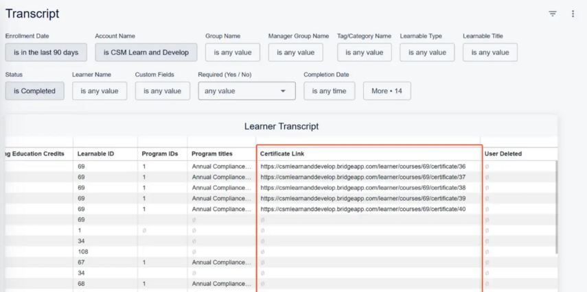- Using Analytics > Transcript to report on certificates in bulk.