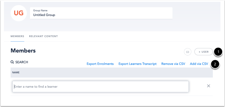 To find users to add to your group, click the + User button [1]. To add users en masse select Add via CSV [2].