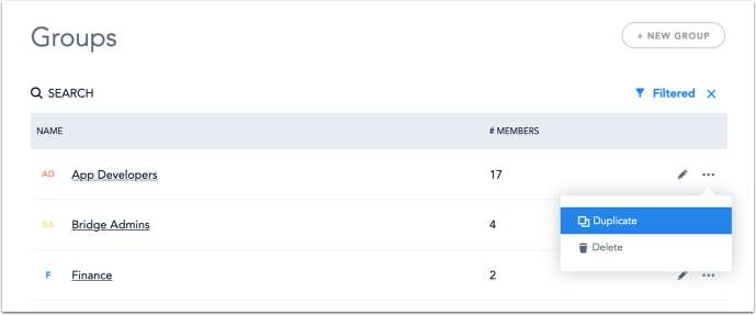 On the Groups page, click the Add New Group button [1]. Click the Add New Group option [2].