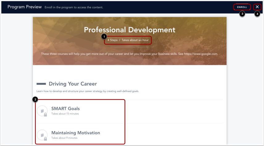 The Program Preview page displays the number of steps in the program and the estimated time to complete it [1]. It also lists all courses, live trainings, and checkpoints in the program, along with their descriptions [2].