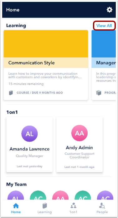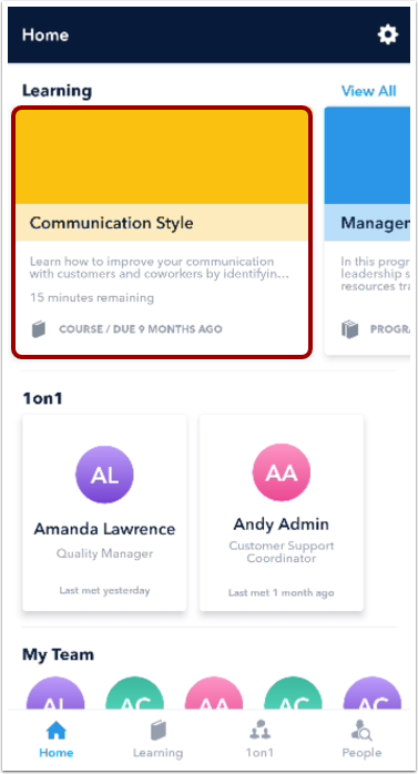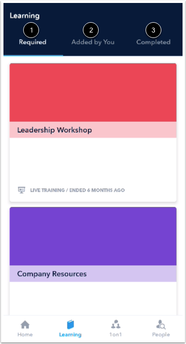 The Learning section in the Home screen displays your required learning items, learning items added by you, and completed learning items. Swipe right to view more learning items. To view a learning item, tap a learning item card.