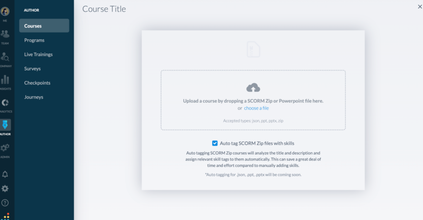 Bridge allows you to create courses by uploading SCORM, AICC, PowerPoint (.ppt and .pptx), and JSON files. Existing uploaded courses created with SCORM and AICC files can only be updated by uploading revised files and cannot be copied using the Course Copy feature.