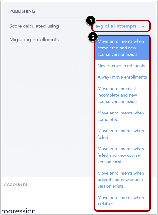 In the Publishing section [5], you can change score calculation settings and enrollment migration settings.